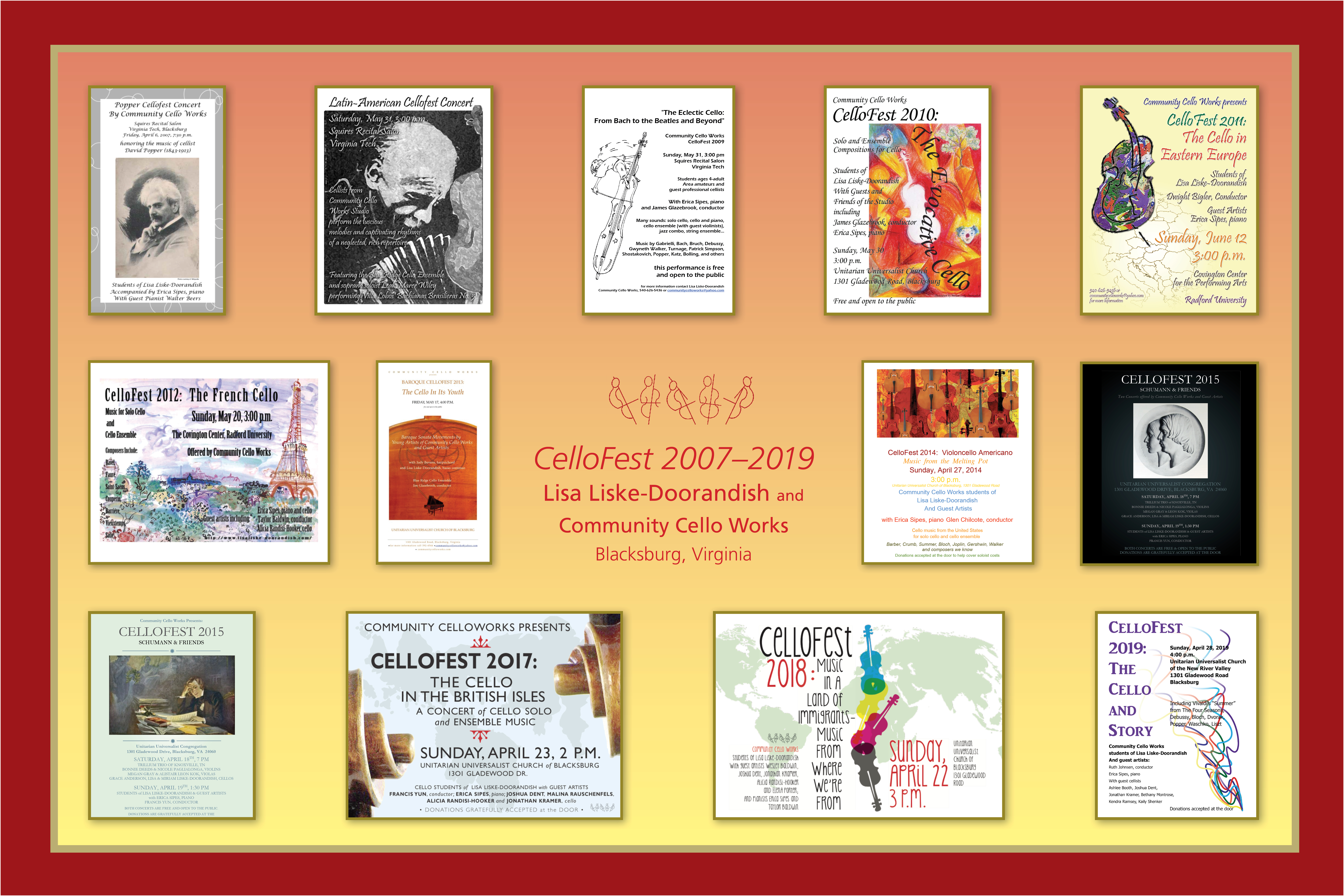 Each year’s CelloFest had a unifying theme. For example: PopperFest, 2007; Latin-American CelloFest, 2008; The Eclectic Cello, 2009; The Evocative Cello, 2010; The Cello In Eastern Europe, 2011; The French Cello, 2012; Violoncello Americano, 2014; Schumann and Friends, 2015.